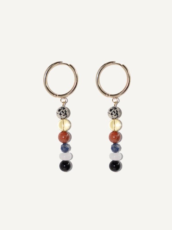 Par de aros de acero quirúrgico enchapados en 18k con mix de piedra naturales: Lapislázuli, Cuarzo, Jaspe rojo, Dálmata, Obsidiana. Terminaciones enchapadas en 18k. Las piedras pueden presentar vetas, marcas internas, zonificaciones o microinclusiones naturales propias de su formación geológica.. Terminaciones enchapadas en 18k.
