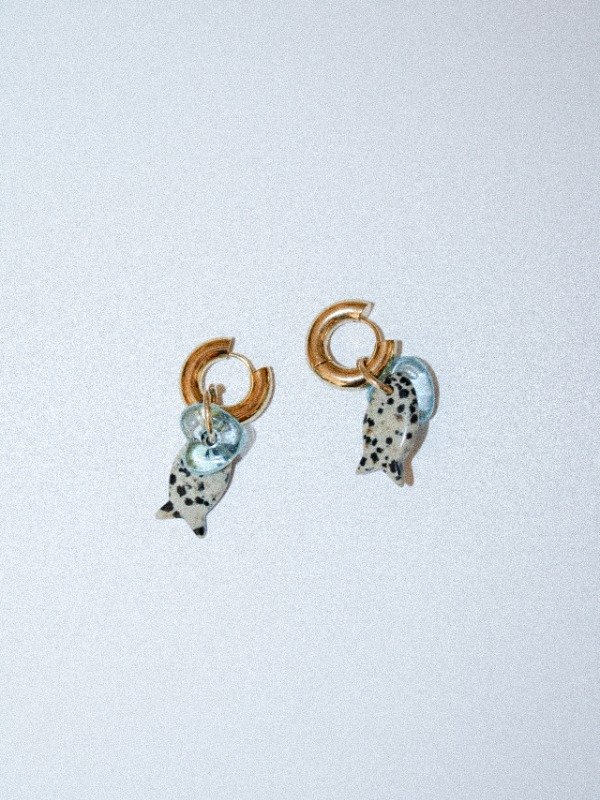 Par de aros de acero quirúrgico dorada con dijes de piedra dálmata en forma de pez y un dije con forma de corazón de vidrio color ambar oscuro. Terminaciones enchapadas en 18k.