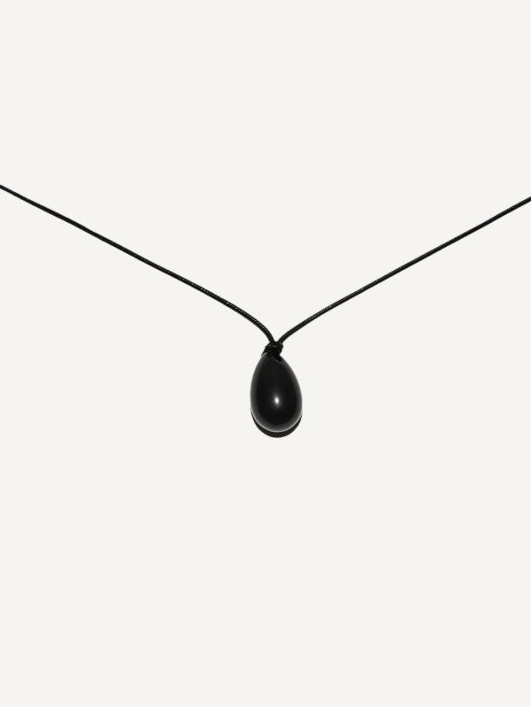 Colgante largo para atar con cordón de polyester tipo cuero negro y huevo de piedra obsidiana natural.