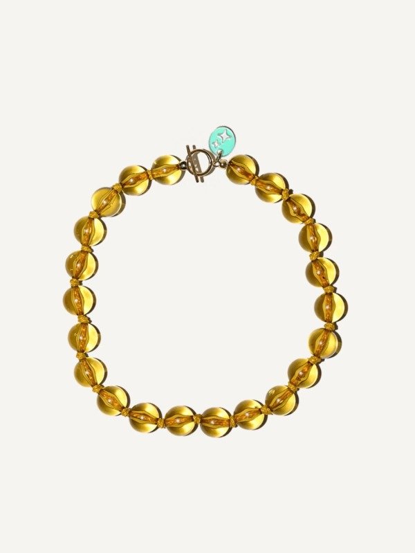 Collar con cuentas de acrílico macizas translúcidas, enfilado en hilo y anudado cuenta por cuenta. Terminaciones enchapadas en 18k. Liviano.