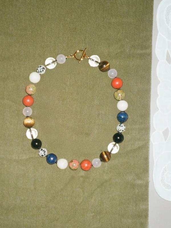 Collar con mix de piedra naturales: Ojo de Tigre, Lapislázuli, Cuarzo rosa, Jaspe rojo, Dálmata, Caliza, Unakita, enfilado en hilo y anudado a mano cuenta por cuenta. Terminaciones enchapadas en 18k. Las piedras pueden presentar vetas, marcas internas, zonificaciones o microinclusiones naturales propias de su formación geológica.
